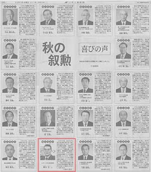 当協会の理事長、柳本忠二が叙勲「旭日双光章」を受賞しました。
