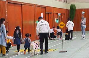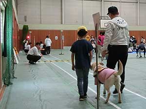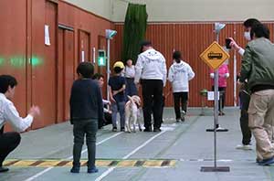 大阪府東大阪市立加納小学校にて3年生児童を対象に、介助犬の講演と訓練体験を実施しました。今回からアリスが活動に参加しました。