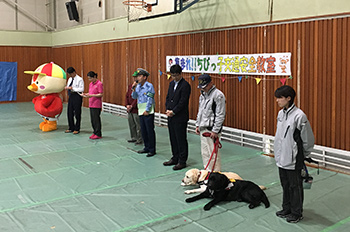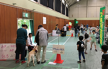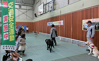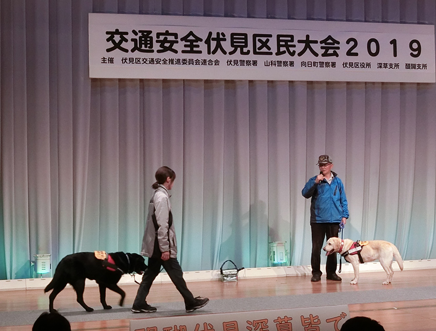 京都市伏見区にて開催された「交通安全伏見区民大会2019」に参加しました。介助犬協会の紹介と介助犬とのふれあいコーナーを実施しました。